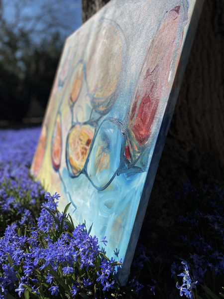 Das Kunstwerk zeichnet sich durch seine lebendige, natürliche Farbpalette aus. Warme Orange- und Rottöne werden von schimmerndem Hellblau umspielt . Das Zusammenspiel von kräftigen Pinselstrichen und zarten, spielerischen Elementen, sowie Schärfe und Unschärfe, erzeugt eine dynamische Spannung, die das Auge des Betrachters in die Tiefe des Bildes führt.